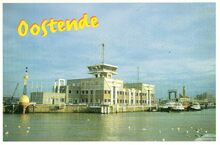 Tropic T 129 - Panorama van de Mercator Jachthaven, ofΒ Het eerste handelsdok gelegen langs de Vindictivelaan (achteraan) en de Leopold III-laan (vooraan). Rechts, het Zeestation. Wat verder, het Montgomerydok en de havengeul. Links, de "Peperbusse" of, De toren van de afgebrande Sint-Pieterskerk en de Sint Petrus en Pauluskerk.Β