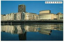 Tropic T 146. - De noordgevel van het vierde Kursaal, gelegen langs de Albert I-promenade, gezien vanaf het Groot Strand. De woontoren "Europacentrum", gelegen langs de Van Iseghemlaan