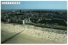 Tropic T 165. - Luchtfoto de Koninklijke Villa. - Panorama van het Groot Strand met de talrijke strandcabines. Rechts, de Nieuwe Gaanderijen en erachter de Koninklijke Villa.Β Ernaast de Venetiaanse Gaanderijen, nu gelegen langs de Koning Bouwewijnpromenade. Links, de Albert I-promenade tot aan de Parijsstraat.