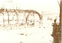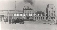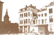 Formaat : 9,5 x 14 cm. - Vernielde gebouwen op de Groentemarkt. Links het torentje van de vleesmarkt