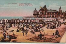 Bijgekleurde kaart. NΒ° 95. - Ostende - La plage et le Kursaal. Het strand en de Kursaal. The Beach and the Kursaal. - Strandrecreatie op het Groot Strand, de traditionele badkarren en op de achtergond, de westgevel van het derde Kursaal langs de Zeedijk