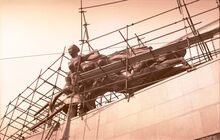Negatief : 6 x 9 cm. - Het plaatsen op het front van de hoofdgevel van de sculptuur "De Communicatiemedia" of "Eenheid van de wereld door telefonie, telegrafie en postverkeer" van Jozef Cantré