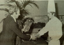 Foto : Guy Pauwels ontvangt de trofee "Beste Kok van België 1975" uit handen van de heer De Zutter, burgemeester van Knokke-Heist. Recept : kalfszwezerik