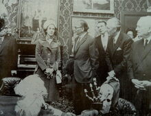 Foto : Koningin Fabiola in gezelschap van conservator Frank Edebau, schepen Alfons Laridon en de heer Despréchin, voorzitter van de "Vrienden van James Ensor"