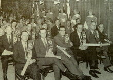 2 foto's : (1) In de ridderzaal van het Casino-Kursaal. De nieuwe ridders, op de eerste rij, van links naar rechts, de heren Jules Daveluy, Luc De Bailly, de Pesseroy, A. Deroux, Emile George en Cdt. Gordts. Op de tweede rij, van links naar rechts, de heren A. Jacquemart, H. Lommerzheim, W. Moortgat, R. Rowan, Achille Vandenberghe en Wilfried Vermast en (2) intronisatie van de heer H. Lommerzheim. Links, Maurice Quaghebeur sr.