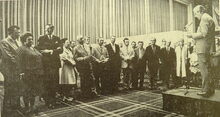 Foto : Vernissage en toespraak door de heer Despréchins, voorzitter van de Vrienden van James Ensor, in aanwezigheid van de burgemeester, leden van het schepencollege en gemeenteraadsleden.