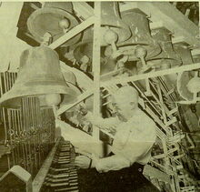 Foto : Beiaardier Ephrem Delmotte aan het klavier van de beiaard in het Feest- en Cultuurpaleis