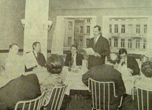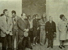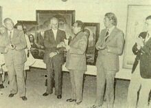 2 foto's : (1) Het publiek tijdens de openingstoespraak van Walter Debrock en (2) van links naar rechts, Marcel Friedrichs, Maurice Boel, Walter Debrock en J. Guillemin tijdens de vernisage