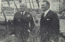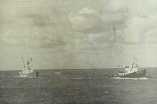 Na een ontploffing in de kamer van de batterijen wordt het lichtschip "Westhinder" op sleeptouw genomen door een sleepboot van het Bestuur van het Zeewezen