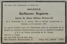 Guilliaume Arthur Faessen. Echtgenoot Elisa Steeland. Geboren te Venloo (Nederland) op 13 april 1891. Verongelukt te Oostende ten gevolge van een bombardement op 8 september 1940