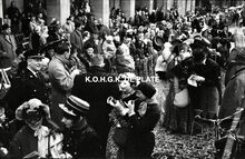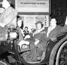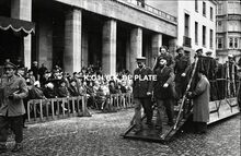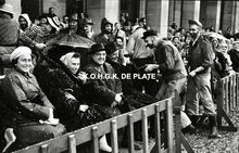 Formaat : 10 x 10 cm. - Burgemeester Jan Piers en genodigden op de tribune tussen de Bonen- en Β de Kadzandstraat. Uiterst rechts, Maurice QuaghebeurΒ sr. met naast hem Kamiel Dehouck