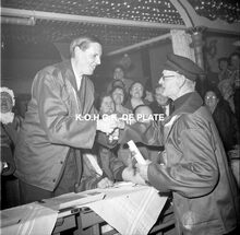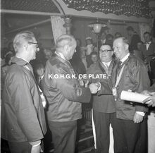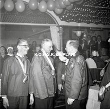 Negatief : 6 x 5,5 cm. - Burgemeester Jan PiersΒ begroet een lid van de "Orde van de Kloeffe". Hier in dancing Carnegie.