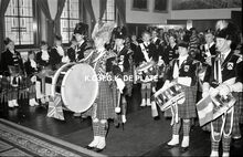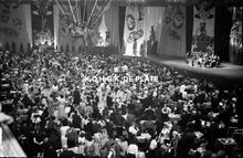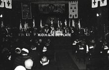Formaat : 12,5 x 19 cm. - Ontvangst op het dienstdoend stadhuis (gerechtshof) naar aanleiding van de overhandiging van de nieuwe vlag. We herkennen o.a. de burgemeester Adolf Van Glabbeke en schepen Maurice Quaghebeur sr. Rechts, de vlag met vlagtop van "Ali Baba en de 40 rovers", en links, de vlag van de "Ostendia Schotten"