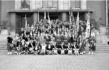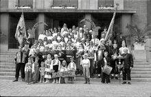 Negatief : 6 x 9 cm. - Viering 10 jaar bestaan. Hier op de trappen van het dienstdoend stadhuis (gerechtshof). In aanwezigheid van o.a. burgemeester Adolf Van Glabbeke, de schepenen Maurice Quaghebeur sr., Kamiel Dehouck en Jan Piers. Gemeenteraadslid Henri Degrave, Henri Smissaert, bestendige afgevaardigde van de provincie. De volgende verenigingen met hun vaandel : de whistmaatschappij "l'Aigle", de Lustige Zigomars, de Oude Ijslandvaarders , de Vismijnvrienden, Ostend Swimming Club, de schuttersgilde Sint-Joris, KVGO toneel en KVGO turnen