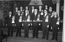 Formaat : 12,5 x 19 cm. - Bestuursleden van de Koninklijke CercleΒ CoecilaΒ in hun kledij van de Hoge Raad van de ConfrΓ©rie Rat Mort tijdens de intronisatie van een nieuw lid. Hier in de ridderzaal van het Casino-Kursaal.