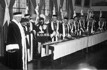 Formaat : 12,5 x 19 cm. - Bestuursleden van de Koninklijke Cercle Coecilia in hun kledij van de Hoge Raad van de ConfrΓ©rie Rat Mort. Hier in het dienstdoend stadhuis (Gerechtshof)