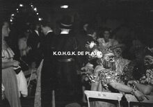 Formaat : 12,5 x 19 cm. - Drie vrouwen van de carnavalgroep "Het Kaartspel" voor hun lokaal van de kaartersclub "L'Aigle du Whist" in cafΓ© "Stad Roeselare"