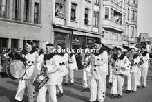 Negatief : 4 x 6,5 cm. - Praalwagen admiraalschip "Popham" bemand door leden van de "Koninklijke Maatschappij de Vereenigde Karabijnschutters" uit Bredene, hier op de Torhoutsesteenweg