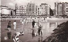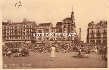 Nels. - Ostende -Β La Plage. Oostende - Het Strand. - Strandrecreatie op het Groot Strand, nabij de badinstallatiesΒ onder de Albert I-promenade. Links, "Hotel Splendid", volledig vernield tijdens de Tweede Wereldoorlog. In het midden, de lichtkolom met openbaar uurwerk van de badinstallaties. Er achter, de Kemmelbergstraat.