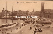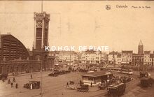 Ern. Thill, Bruxelles, sΓ©rie 13, NΒ° 22. - Ostende - La Gare et entrΓ©e de la Ville. - Links, schepen gemeerd in het eerste handelsdok. Verkeer op de Kapellebrug en rechts, een gedeelte van het tweede handelsdok. Rechts, het spoorwegstation Oostende -Stad, met toren en openbaar uurwerk. Twee kusttrams op de Vandersweepplaats. Het gebouw met torentje, links, is het politiebureau van de wijk Hazegras. Op de achtergrond, de toren van de Hazegraskerk.