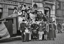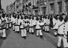 Formaat : 12,5 x 19 cm. - De stadsharmonie in pierrotpakken, gevolgd door de carnavalgroep "Het Kaartspel", op de Visserskaai