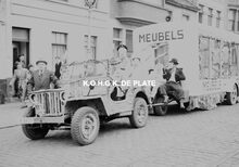 Negatief : 4 x 6,5 cm. - Vrachtwagens van de bierbrouwerij Meiresonne uit Gent in de publiciteitskaravaan op de Torhoutsesteenweg
