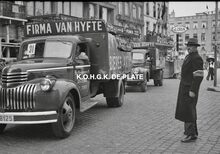 Negatief : 4 x 6,5 cm. - Twee vrachtwagens van bierhandel "Van Hyfte", Aartshertoginnestraat 18,Β in de publiciteitscaravanΒ op het Wapenplein