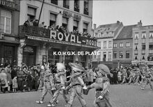 Negatief : 4 x 6,5 cm. - Inhuldiging van het vaandel van de Whistmaatschappij "Ostendia". Hier op het Canadaplein op weg naar de plechtigheid in het dienstdoend stadhuis (gerechtshof). Op de achtergrond, de Hendrik Serruyslaan