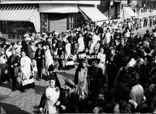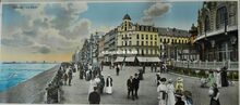 Rechts het kursaal. Op de hoek van de Kursaal-Oosthelling, het "Hotel Royal Belge" waar paard en kar staan te wachten om reizigers te vervoeren. Verder op de Zeedijk, de oude hotels en villaβs en veel wandelaars