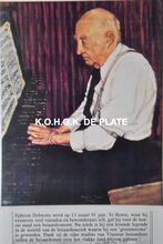 Onder foto :Β Ephrem Delmotte werd op 13 maart 91 jaar.Te Ronse, waar hij eveneens veel vrienden en bewonderaars telt gaf hij voor de laatste maal een beiaardconcert. Nu reeds is het een levende legende in de wereld van de beiaardmuziek waarin hij een βgrootmeesterβ is geworden.Dankzij de rijke traditie van Vlaamse beiaardiers zullen de beiaardtonen over het vlakke land blijven halmen!