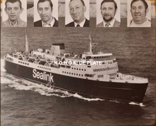 Fotomontage van Carferry Prince Laurent; met fotoβs van de 4Β bemanningsleden van de machinekamer en de commandant