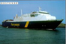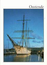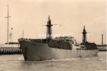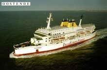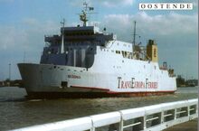 Tropic T 367. - Het vrachtschip verlaat de haven van Oostende. Vooraan, detail van het Weststaketsel