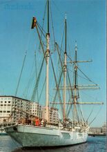 Formaat : 9 x 13 cm. - Zeilschip "Gallant" in de havengeul. In de achtergrond het Ooststaketsel