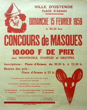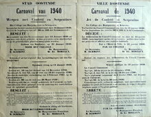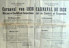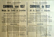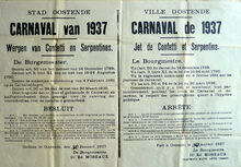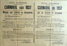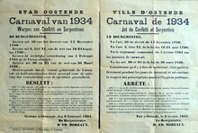 Formaat : 37 x 55 cm. - Tweetalig. - Ville d'Ostende. Carnaval de 1934. Jet de Confetti et Serpentins. Getekend : de burgemeester, Dr. Ed. Moreaux