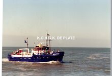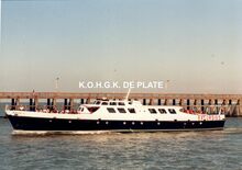Formaat : 9 x 13 cm. - Excursieschip "Franlis" in de havengeul. In de achtergrond het Ooststaketsel