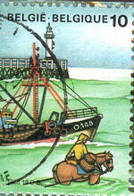 Formaat : 4 x 3 cm. - Vissersvaartuig O.148 'Snipe" in de havengeul. Op de voorgrond een garnaalvisser. In de achtergrond het Weststaketsel. Ontworpen door Oscar Bonnevalle en gedrukt bij Zegeldrukkerij Mechelen