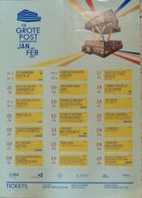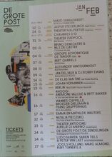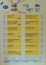 Formaat : 42 x 30 cm. - 01/03 Augustij - 08/03 Anima Eterna Brugge & Thomas Bauer - 10/03 Misst - 16/03 Frank Boeijen - 23/03 What's is going on? Ft. Saul Williams E.A. - 24/03 Jowest! - 30-31/03 De kortste nacht van acht tot acht ft. Jo Mersa (Marley) East End Rock, E.A. - 31/03 Trio Khaldei - 05/04 Flying Horseman - 07/04 De VΓ©lo - 26/04 Wim Opbrouck & Ron Heuman - 28/04 Myrddin Solo