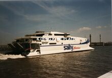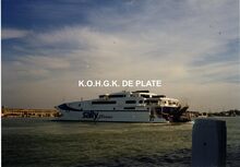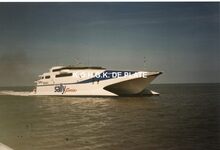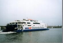 Formaat : 9 x 13 cm. - SeaCat "Eapide van Hoverspeed Oostende-Dover vaart de haven van Oostende binnen. Op de achtergrond het Ooststaketsel.