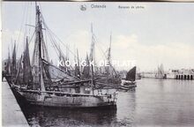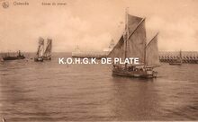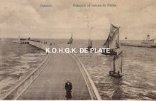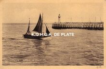 Ostende - Entrée du port - Het Weststaketsel. Enkele zeilvisserssloepen in de havengeul. Rechts, gedeelte van het Ooststaketsel
