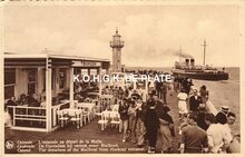 Postkaart N.S.Br. - Bijgekleurde kaart. - Ostende - L'estacade. - We zien "'t koptje van 't hoofd", of het einde van het Weststaketsel, met het café-paviljoen en het ijzeren torentje met mistbel. Je kon er ook met een kruisnet een krabbetje vangen. Oostende in de Belle Epoque.