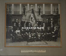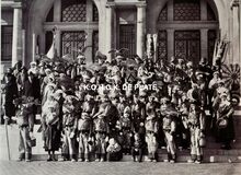 Groepsfoto van de Toneelmaatschappij “ Door Strijd tot Zege!” met vaandel op de binnenkoer van het "Grand Hotel Fontaine"