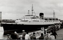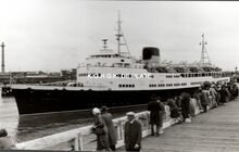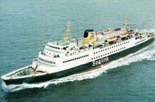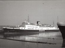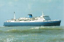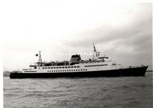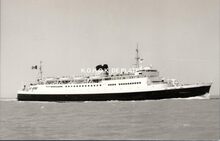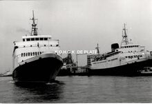 Formaat : 10 x 16,5 cm. - Rechts de carferry "Koningin Fabiola" aan de laadbrug.