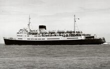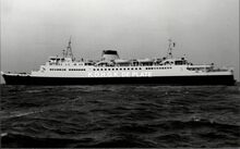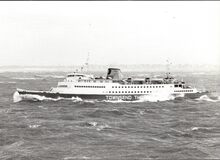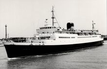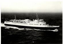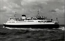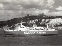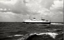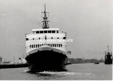 Formaat : 10 x 16,5 cm. - Carferry "Koningn Fabiola" in de havengeul. Links, op de oosteroever, de vierde vuurtoren (Lange Nelle). Gebouwd op de scheepswerf Jos. Boel en Zonen (Temse). Het schip liep van stapel op 20 november 1961 en kwam in dienst op 10 juni vóór het seizoen van 1962. Het was uitgerust met een boegschroef om de manoeuvres bij het aanleggen te vergemakkelijken