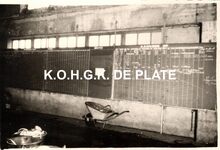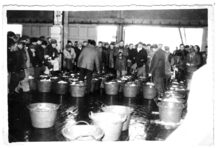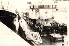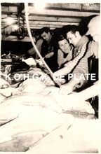 Foto : 8,5 x 12 cm. - De vangst wordt gelost. De vis wordt in grote losbennen één voor één uit het visruim gehesen