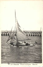 Albert, N° 130. Phototypie A. Dohmen, Bruxelles. - Ostende - Plaisirs nautiques. Ostende. - Zeiljacht in de havengeul van Oostende. Op de achtergrond, het Ooststaketsel.