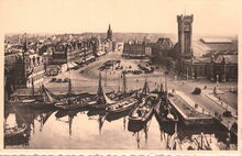 Formaat : 8,5 x 12 cm. - Het Vissserijdok. Een vissersvaartuig gaat aanmeren langs de kaai van de Vismijn. Op de achtergrond, de vuurtoren "Lange Nelle".