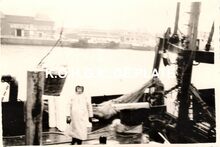 Formaat : 8,5 x 12 cm. - Het Visserijdok. Het vissersvaartuig is aangemeerd langs de kaai van de Vismijn. Het lossen van de vis kan beginnen.