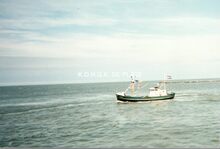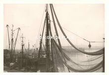 Formaat : 9 x 13 cm. - Vissersvaartuig O.23 "Geoffrey-William" in de havengeul. Op de achtergrond, de tijseinpost op het Oostaketsel