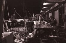 FormaatΒ : 17,5 x 27 cm. - De visbennenΒ wordenΒ door middelΒ van een lostakelΒ op de sorteertafelΒ gezwierd. Het lossenΒ en sorteren van de vis, de avondΒ voorΒ de verkoop.