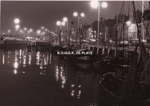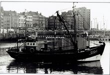 FormaatΒ : 17,5 x 27 cm. - Het vissersvaartuigΒ O.104 "Zeehond" in het Montgomerydok. Op de achtergrond, de VisserskaaiΒ